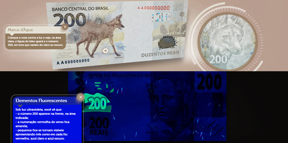 Sob luz ultravioleta, é possível enxergar o número 200 na frente e a numeração vermelha do verso aparece na cor amarela. Além disso, pequenos fios coloridos se tornam visíveis.